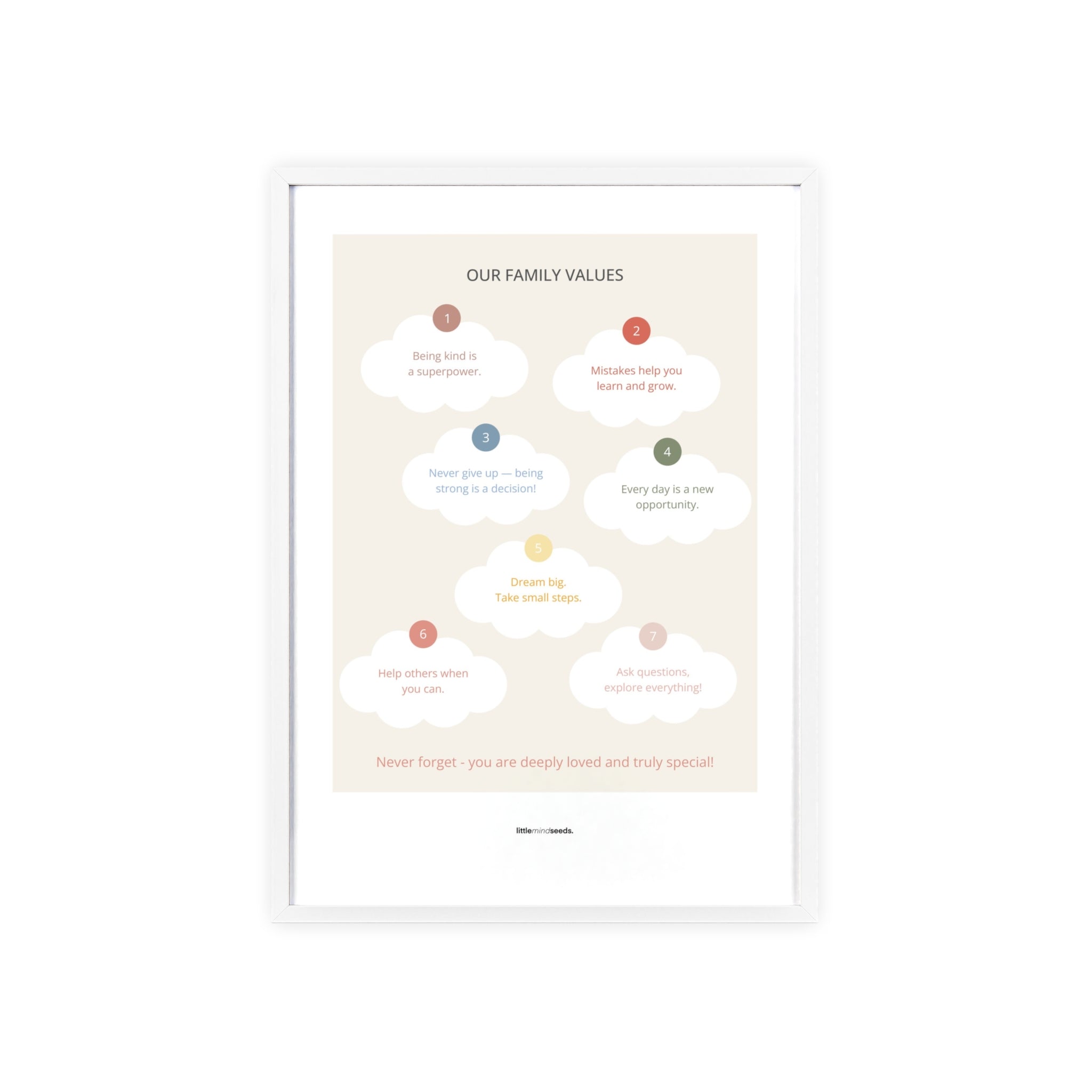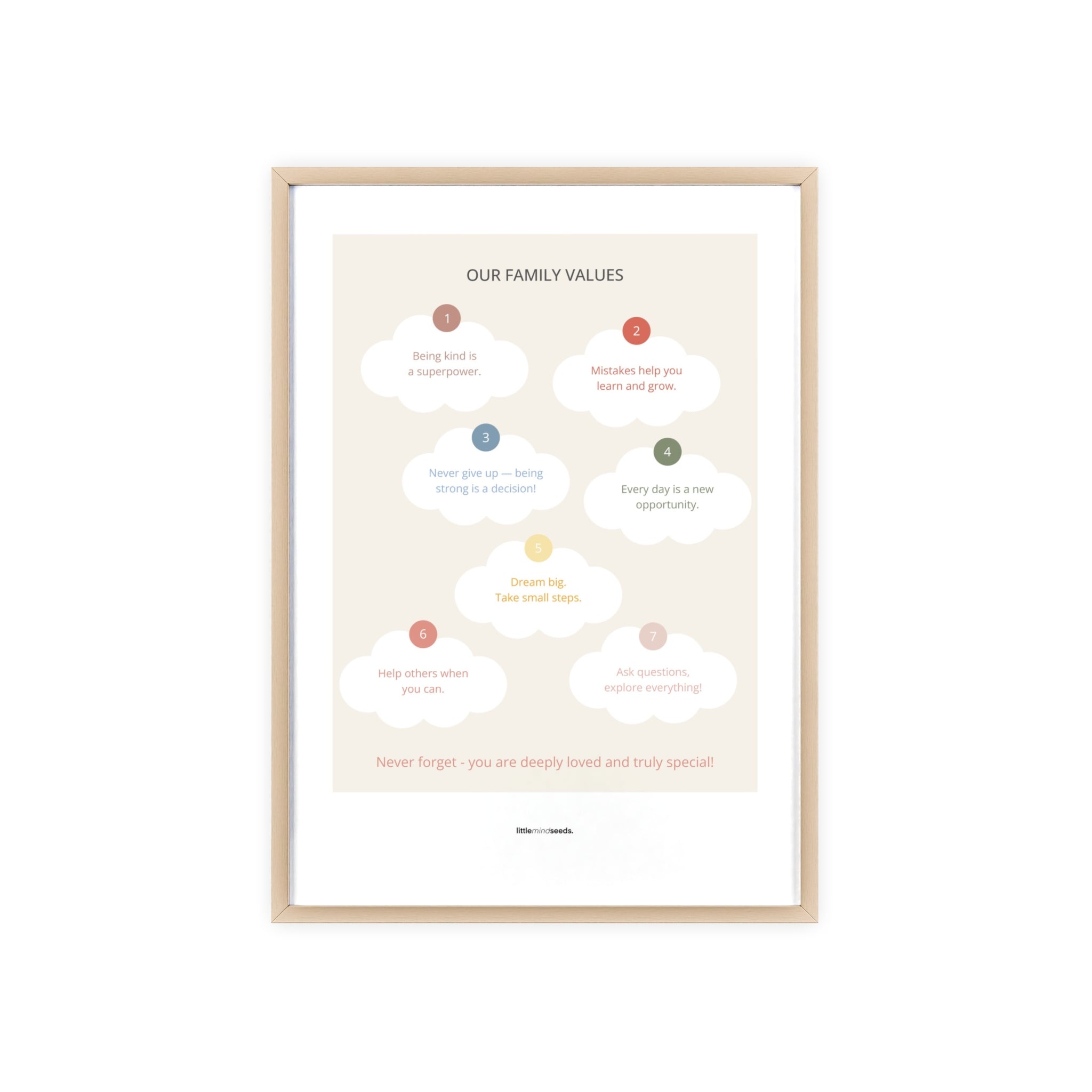 Our “Family Values” minimalist motivational Framed Poster reminds children of the simple principles that build happy, supportive homes. It encourages kindness, resilience, curiosity, and gratitude — helping young minds understand that strong values create harmony, connection, and confidence within the family and beyond.