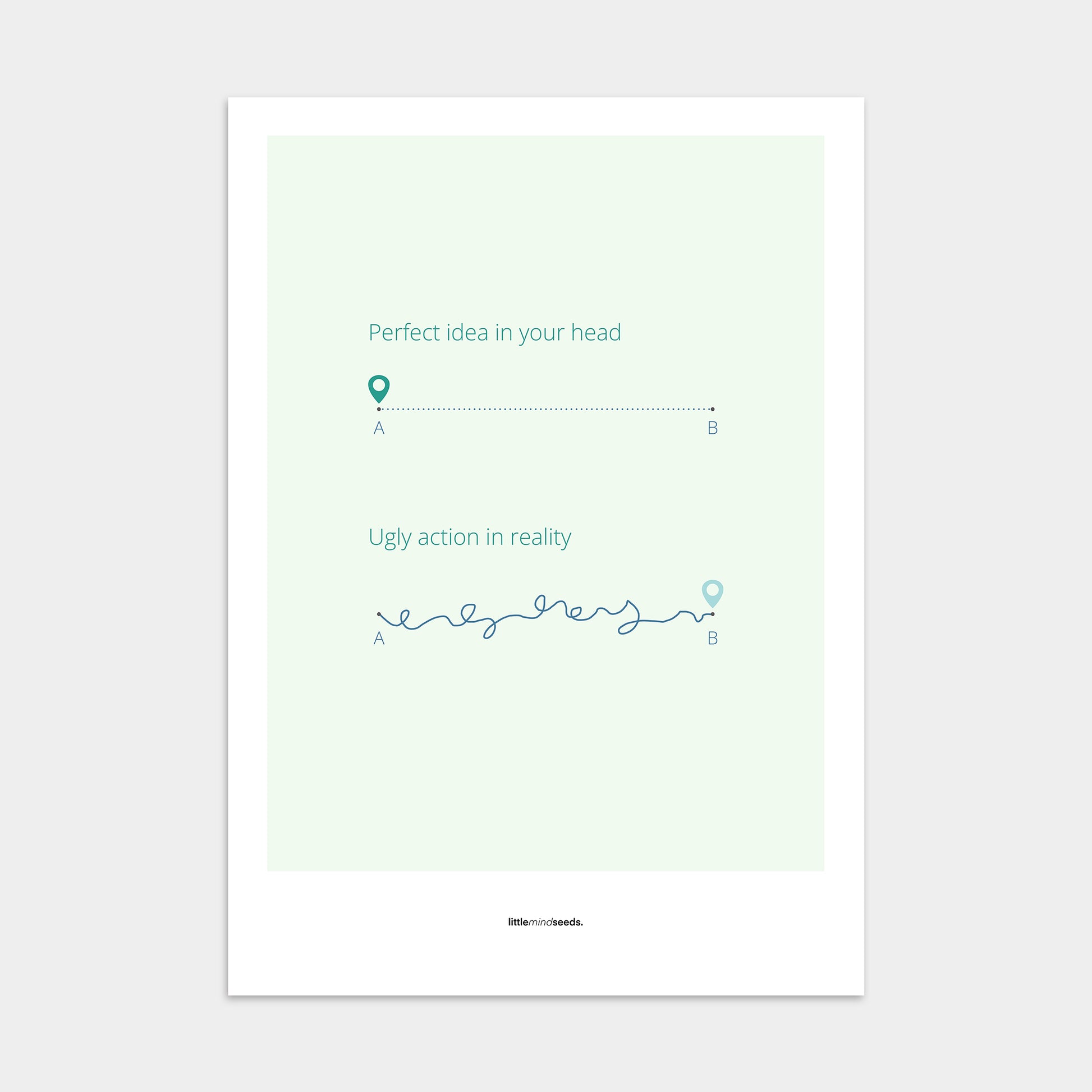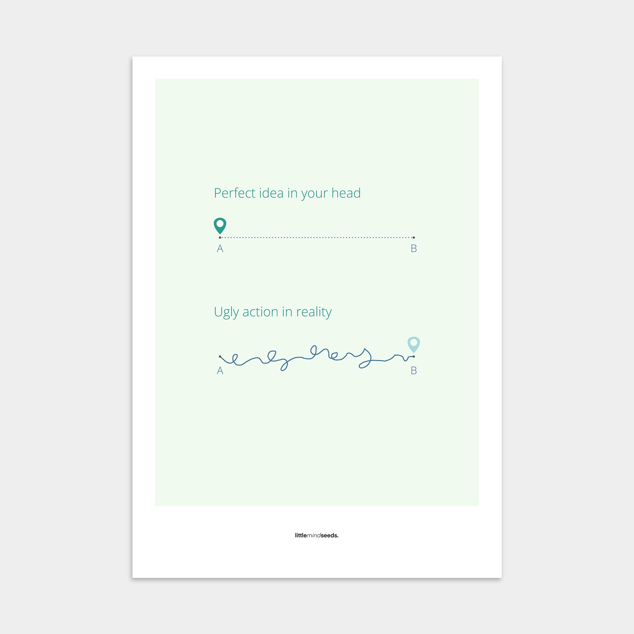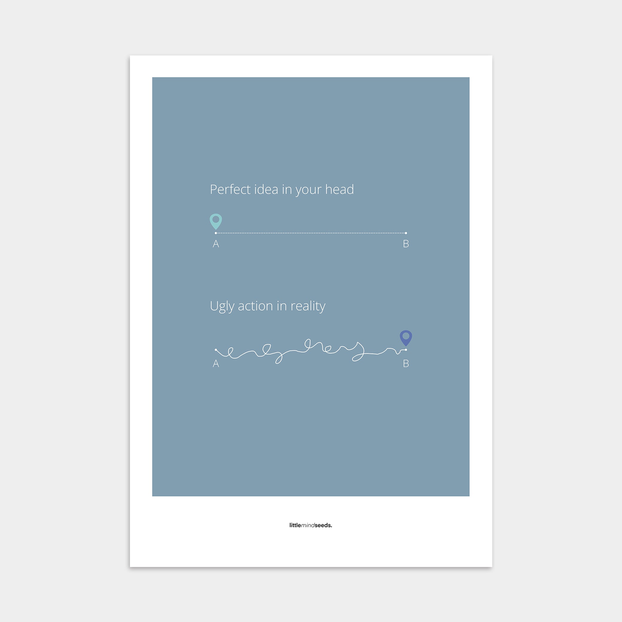 Our “Perfect Idea in Your Head vs Ugly Action in Reality” motivational poster shows kids that taking action matters more than waiting for perfection.