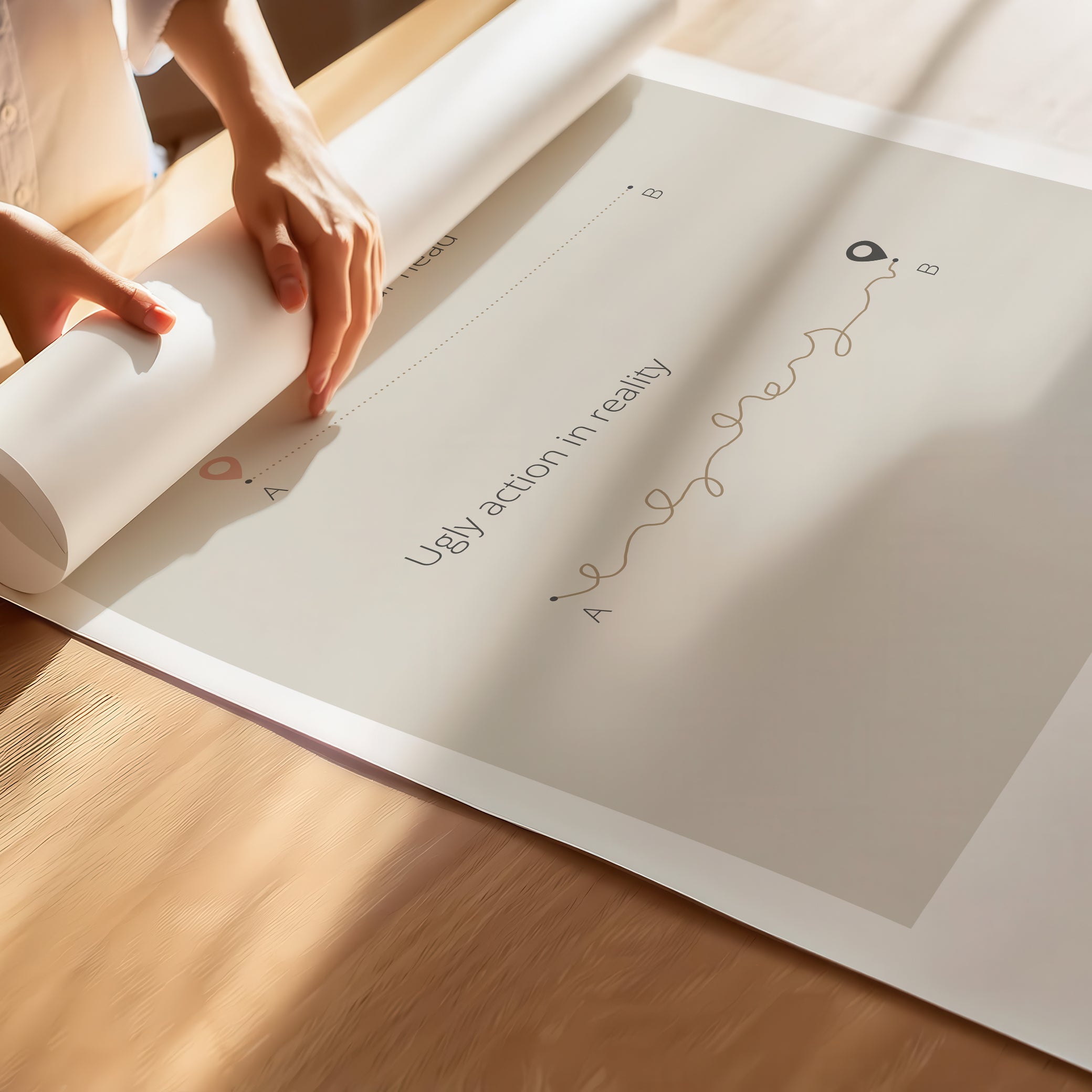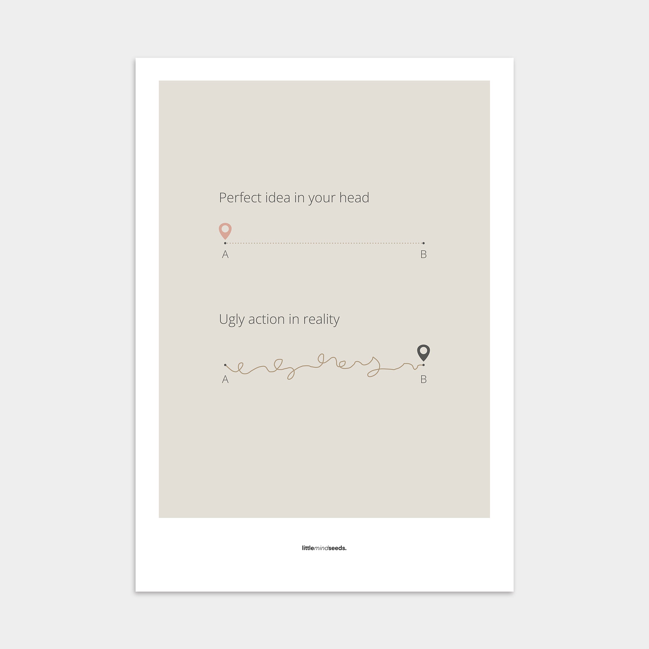 Our “Perfect Idea vs Ugly Action in Reality” minimalist motivational poster is a visual reminder that while our plans may seem flawless in our minds, the real journey involves messy starts, mistakes, and adjustments along the way. What matters is taking action, even when it’s not perfect.