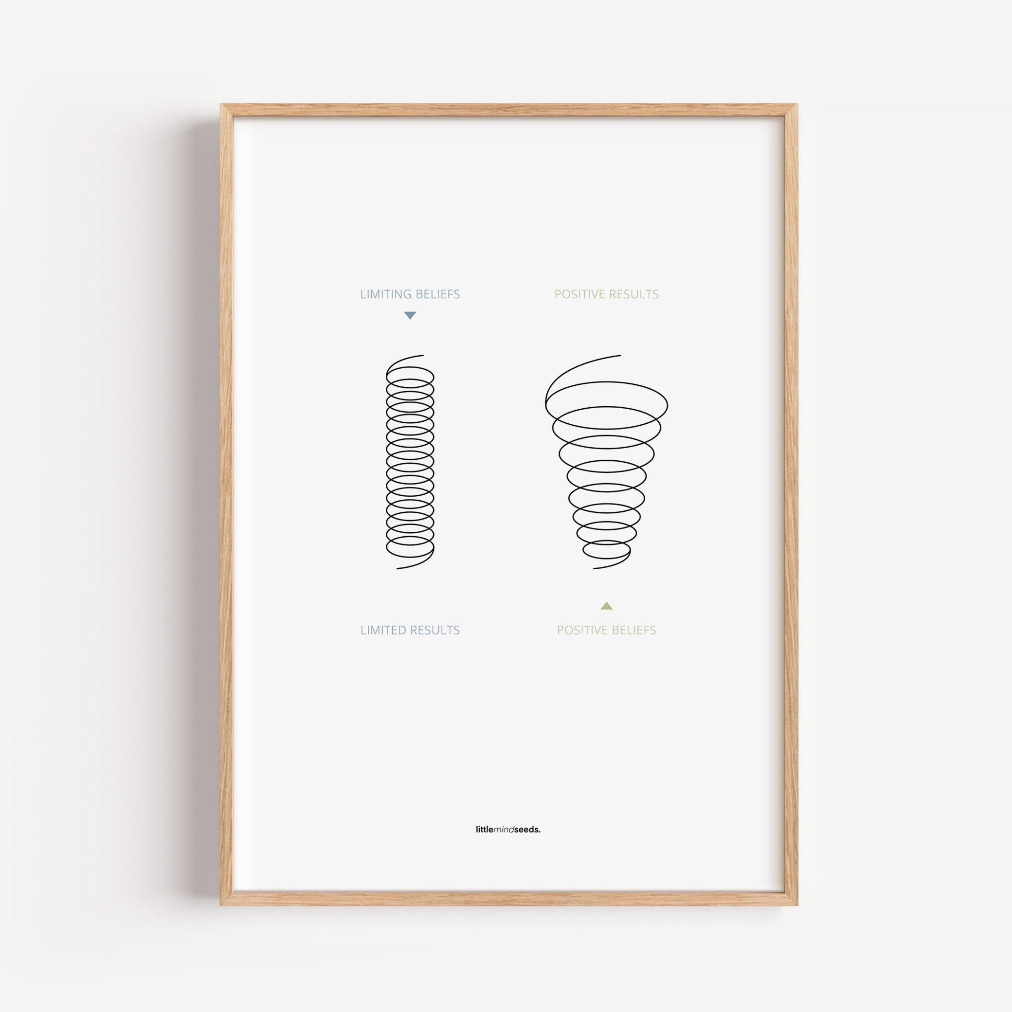 On the left, a downward spiral shows how limiting beliefs quietly lead to limited outcomes. On the right, an upward spiral illustrates how positive beliefs unlock growth, confidence, and brighter possibilities.