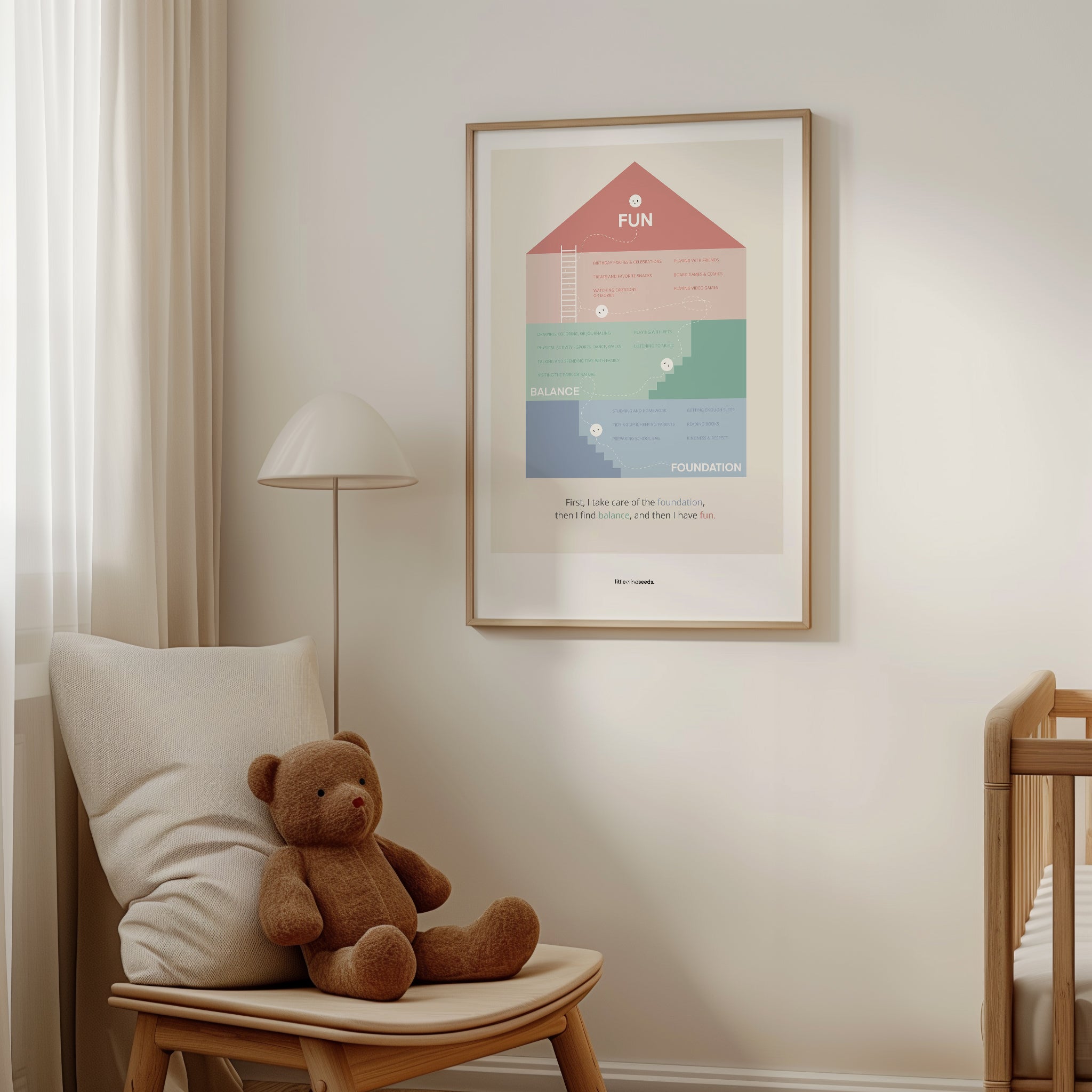 This artwork is a gentle reminder that life, like a house, grows strong when built step by step, from the ground up. It teaches children (and adults alike) that lasting happiness comes from first securing their base, then finding balance, and finally embracing the fun that makes life bright.