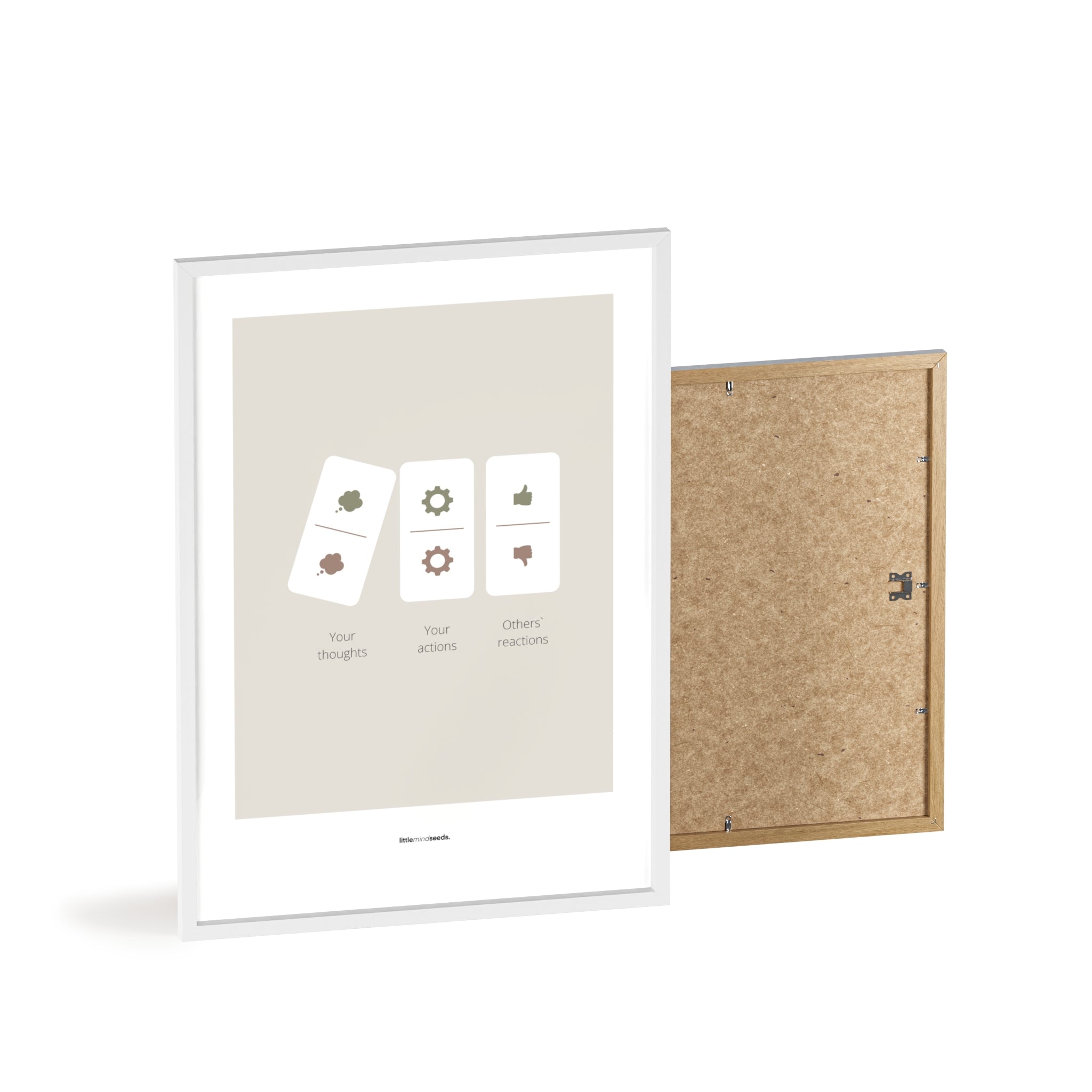 Our “Your Thoughts Turn Into Actions” minimalist motivational Framed Poster shows the chain reaction from thoughts to actions to others’ reactions. It’s a powerful visual reminder that our mindset shapes how we behave—and how the world reacts in return.